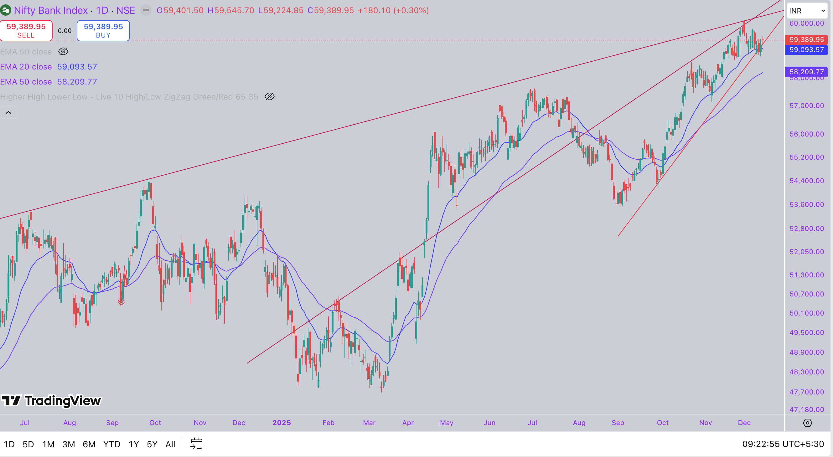 Sustained trade above 59,600–59,700 could open a clean upward extension toward the 60,000–61,000 zone, supported by improving credit demand and favourable borrowing conditions. Downside support is placed at 59,000–58,800; a break below this may introduce short-term caution, but the medium-term trend continues positive.