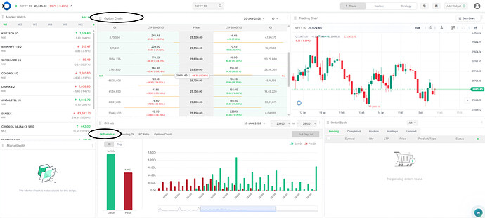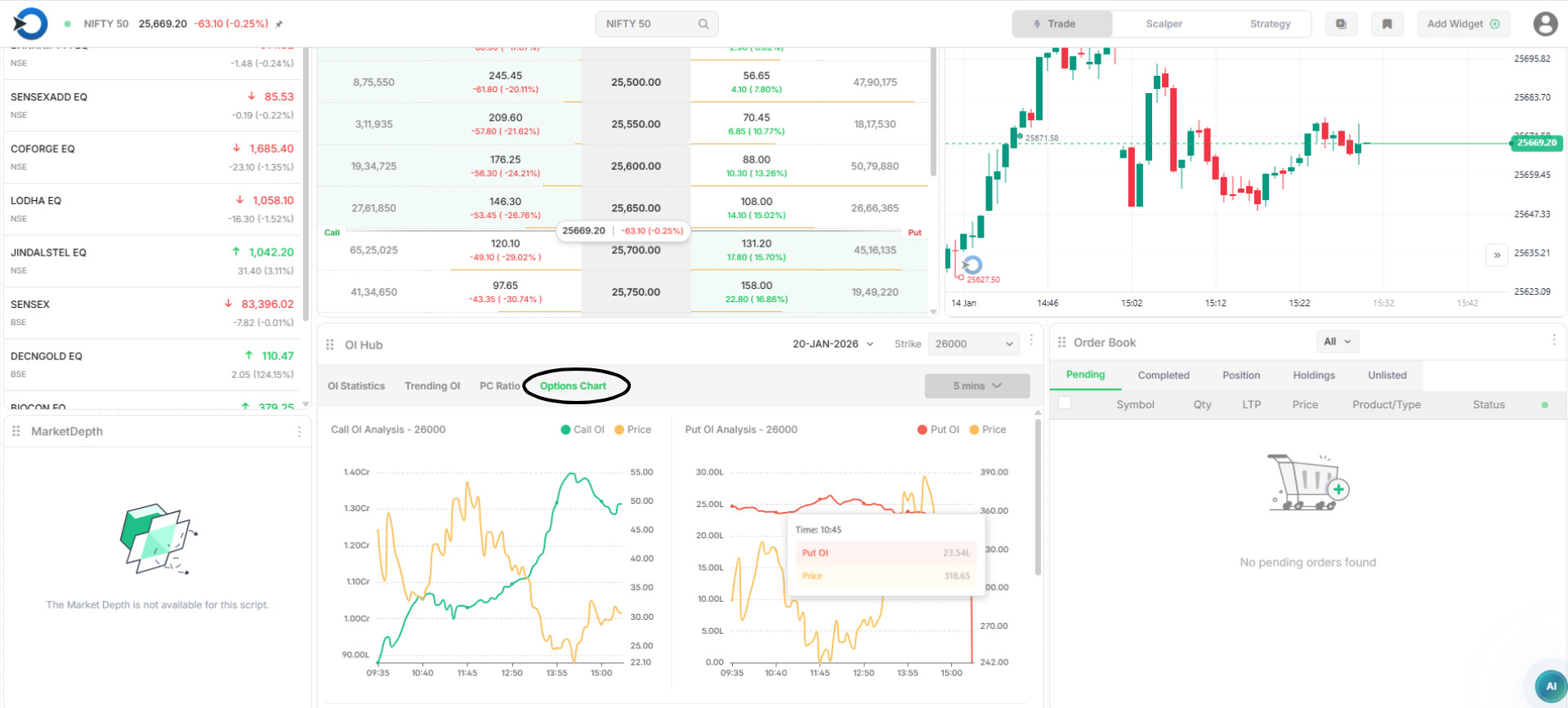 Options Chart shows how option price and Open Interest (OI) are moving together for a selected strike price.