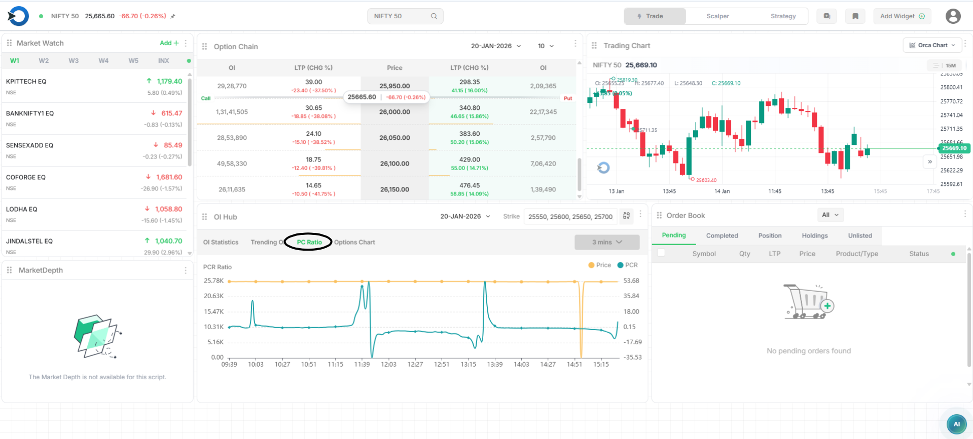 Trending OI shows how Call OI and Put OI are changing in real time.