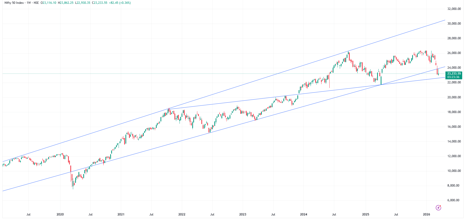 The Nifty 50 has now broken below its broader rising channel, confirming a trendline breakdown and signaling a shift from a bullish structure to a corrective/downtrend phase. The breach of this long-term support trendline indicates weakening market structure and increasing dominance of sellers.