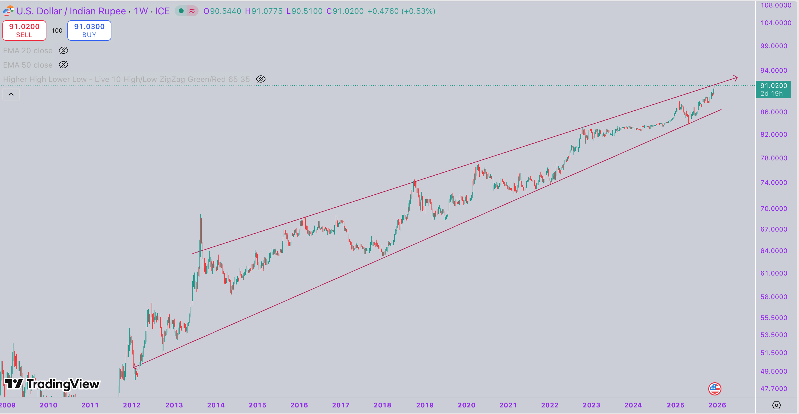 The long-term USD/INR chart has been trading within a well-defined rising wedge structure for over a decade. Price action continues to form higher highs and higher lows, reinforcing the view that the broader trend remains firmly upward.